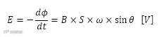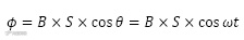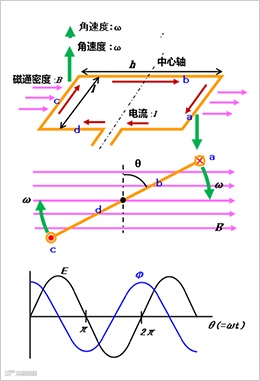 此时,假设线圈表面的平行方向(中间图中的黄线)和相对于磁通密度方向的垂直线(黑色虚线)形成角度为θ(=ωt),则穿透线圈的磁通量Φ由下式表示: