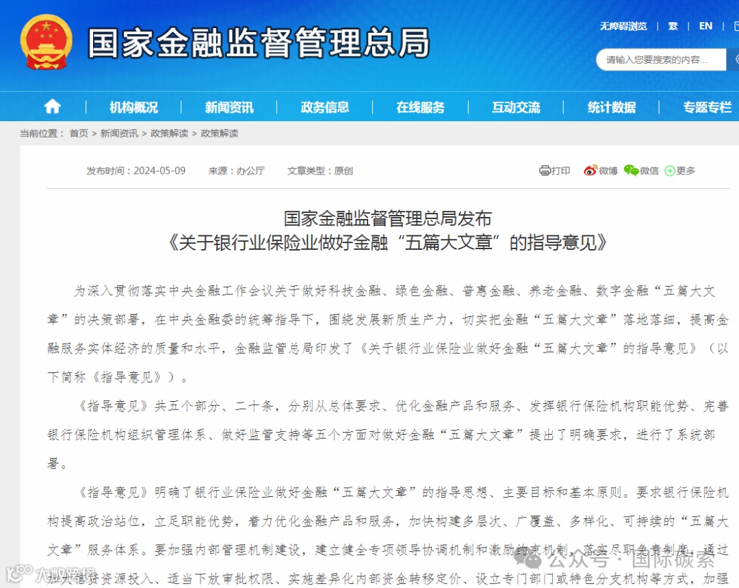 国家金融监督管理总局在5月9日的官方网站上发布了一则重要消息,宣布金融监管总局已正式出台《关于银行业保险业做好金融“五篇大文章”的指导意见》。这份文件着重强调了对环境权益抵质押融资的发展,特别是碳排放权和排污权等权益的融资方式,为绿色金融发展注入了新的活力。