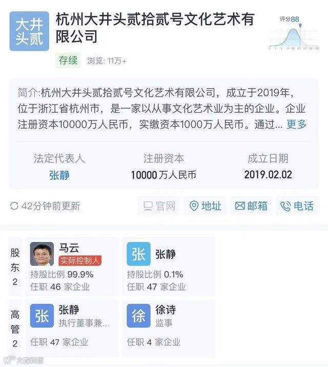 7月20日,一家名为一米八海洋科技的公司成立。根据天眼查显示,该公司持股80%的大股东为1.8 Meters,还有一家持股10%的股东,叫杭州大井头贰拾贰号文化艺术有限公司,这家公司由马云持股99.9%。正是这家公司,透露了马云的最新动态。