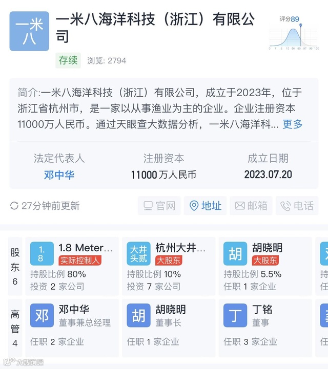 7月28日,一米八海洋科技投资了一米八海洋科技(舟山)有限公司,其大股东1.8 Meters在今年5月和7月还分别成了一米八农业科技(海南)有限公司和一米八海洋科技(浙江)有限公司。