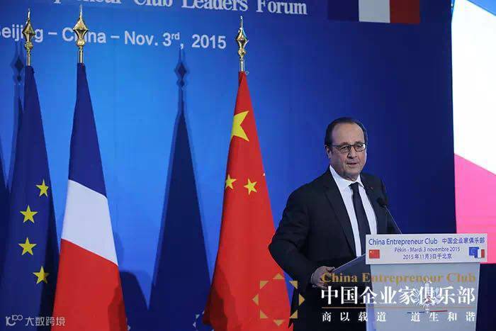 这是奥朗德总统第二次对我国进行的正式国事访问,感谢总统在今天北京的清晨与中国工商界人士的正式会面,今天也是中国商业外交史上一个突破性的日子,是外国元首第一次和中国民营企业家群体进行正式的对话,感谢总统您和您的团队做出的巨大努力。今天在现场除了总统阁下一行,还有中国企业家俱乐部的成员,有中国创业型公司的行业领袖,还有媒体领袖,以及中法两国的记者朋友们。今天的活动邀请函发出以后,几百个位席瞬间被抢完,大家争相前来聆听总统阁下的演讲。法国文化代表了精致、优美、想象力和创造力,在中国受到了无数人的欢迎,我本人也非常喜欢法国,这是一个连水都能做出魔术来的国家,当然法国最具有魅力的是创造出灿烂文化的那些人民。