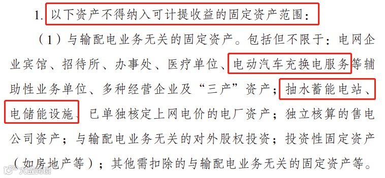 2019年5月24日,国家发改委、国家能源局联合签发的《输配电定价成本监审办法》(发改价格规〔2019〕897号)的通知(下文简称“办法”)明确:“抽水蓄能电站、电储能设施、电网所属且已单独核定上网电价的电厂的成本费用”不得计入输配电定价成本。在2020年2月5日,国家发改委印发的《省级电网输配电价定价办法》中再次明确,电动汽车充换电服务、抽水蓄能现在、电储能设施等,不得纳入固定资产范围。