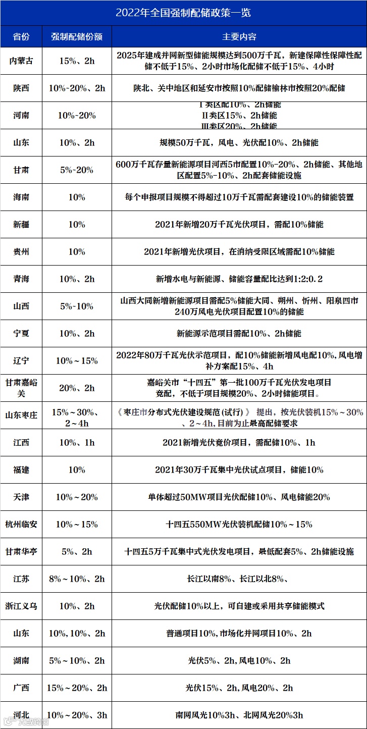 各省新能源项目,强制配储比例、补贴政策一览!
