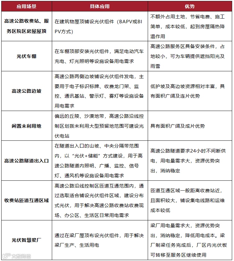 本文所述“光伏+高速公路”模式,一般指利用高速公路沿线的边坡、加油站、服务区、隧道隔离带、停车场遮阳棚、互通立交和匝道中的闲置土地等土地资源布置太阳能光伏组件,实现光伏发电、储能,为高速公路的运行、新能源汽车提供用能保障,并网模式一般为“自发自用,余电上网”。