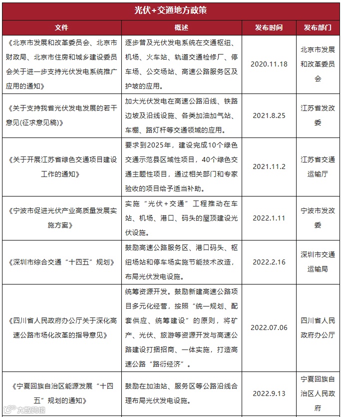 在我国提出双碳战略后,我国各部门对光伏与交通融合发展,发布了以下政策: