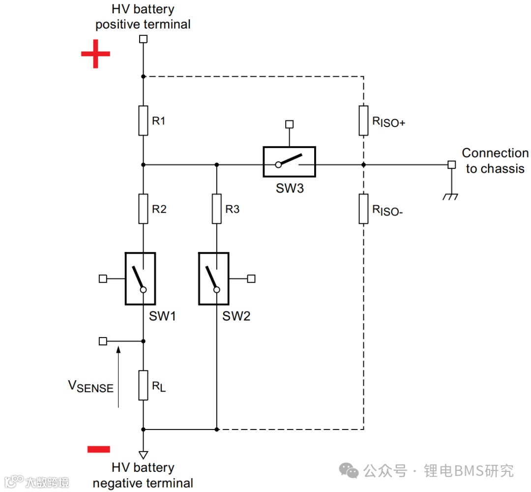 述图示电路中,增加三路开关,四个已知电阻 R1 、R2、R3、RL,,通过交替切换开关 SW1 、SW2 改变两极对地的等效电阻,得到正、负极检测电阻上不平衡的检测电压 Vsense,从而计算出正负极的绝缘电阻,正负极检测电阻上的电压随着开关切换周期变化,当某一极绝缘电阻变低时该侧检测电阻电压变小,对应另一侧检测电阻的电压变大。