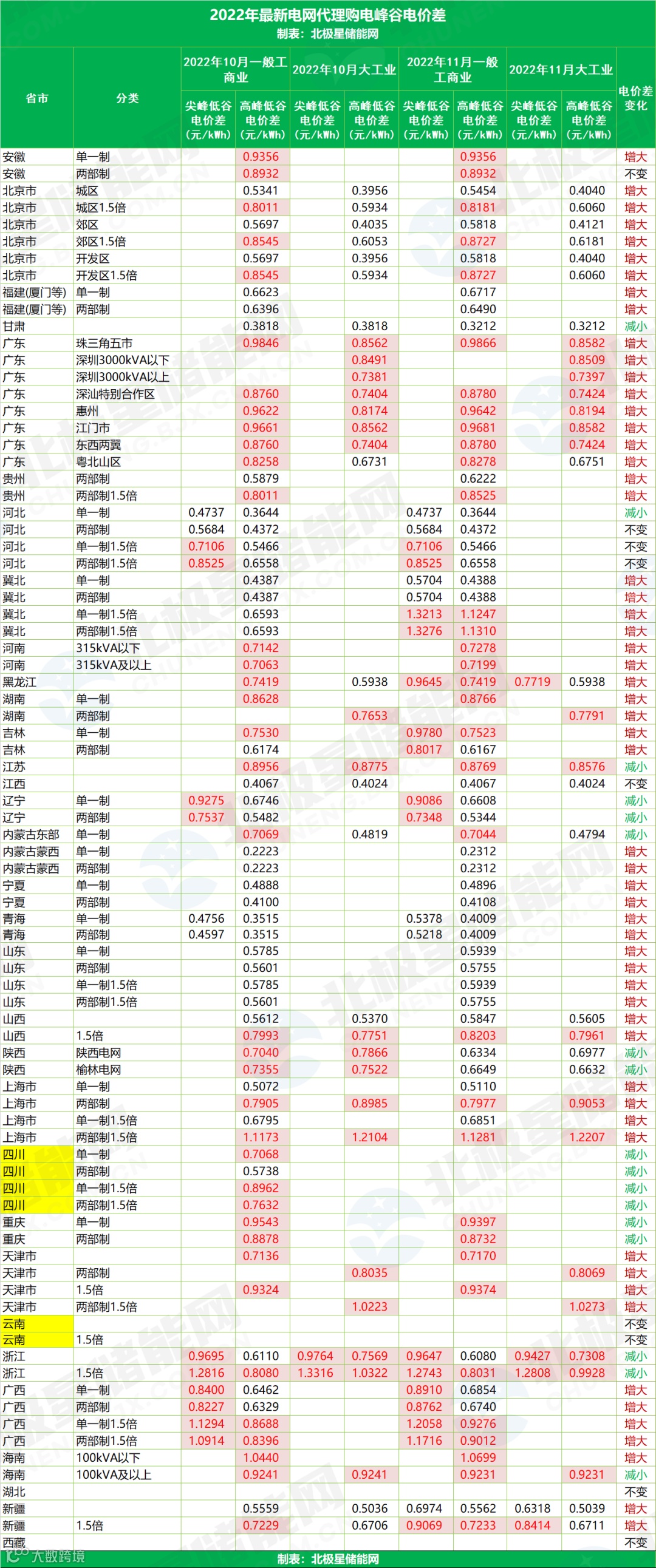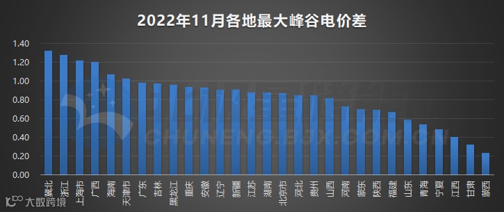 以下为各省峰谷电价差汇总,以及各省电网代理购电价格、峰谷电价走势详情。
