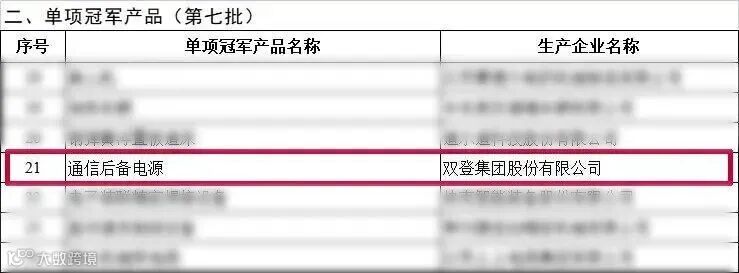 近日,工业和信息化部、中国工业经济联合会联合公示了第七批制造业单项冠军企业(产品)名单,双登集团股份有限公司主营产品“通信后备电源”被评定为“制造业单项冠军产品”,是泰州市主城区内今年唯一一家获评的企业。
