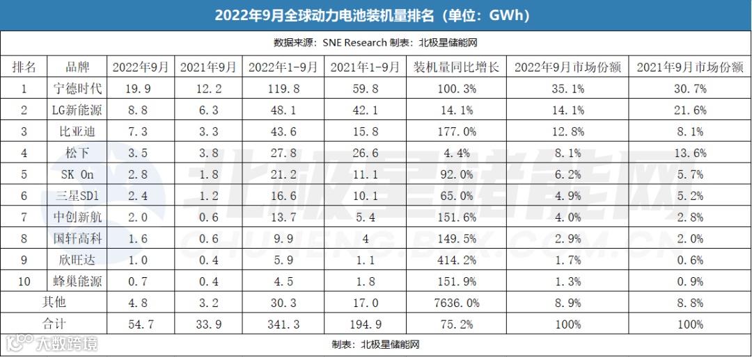 9月全球动力电池装机量TOP10!LG反超比亚迪重回第二