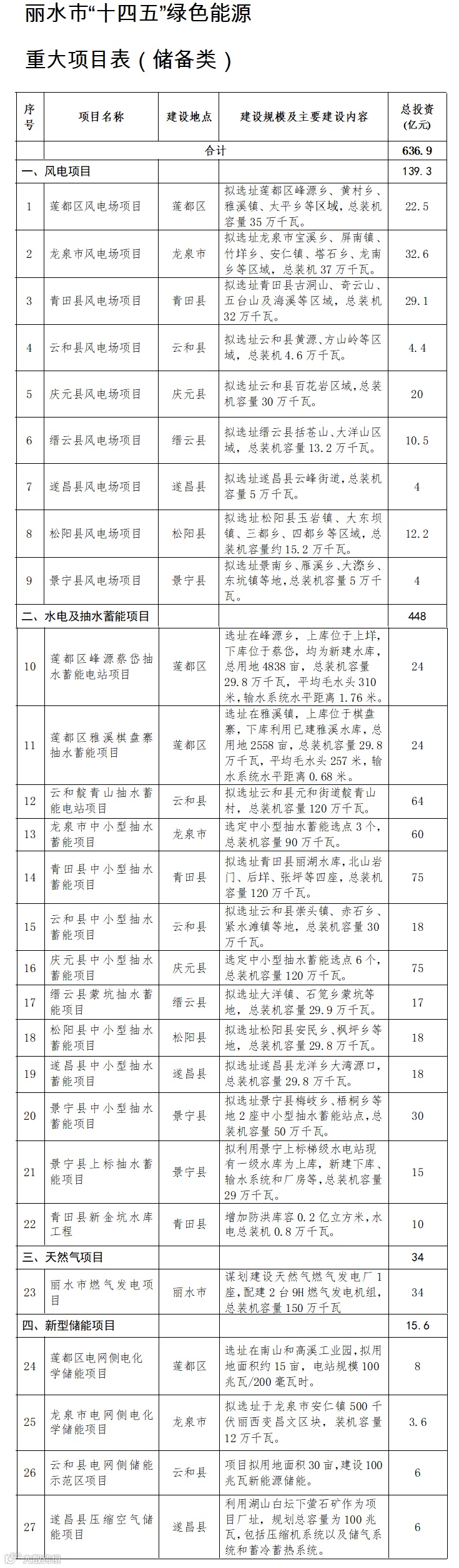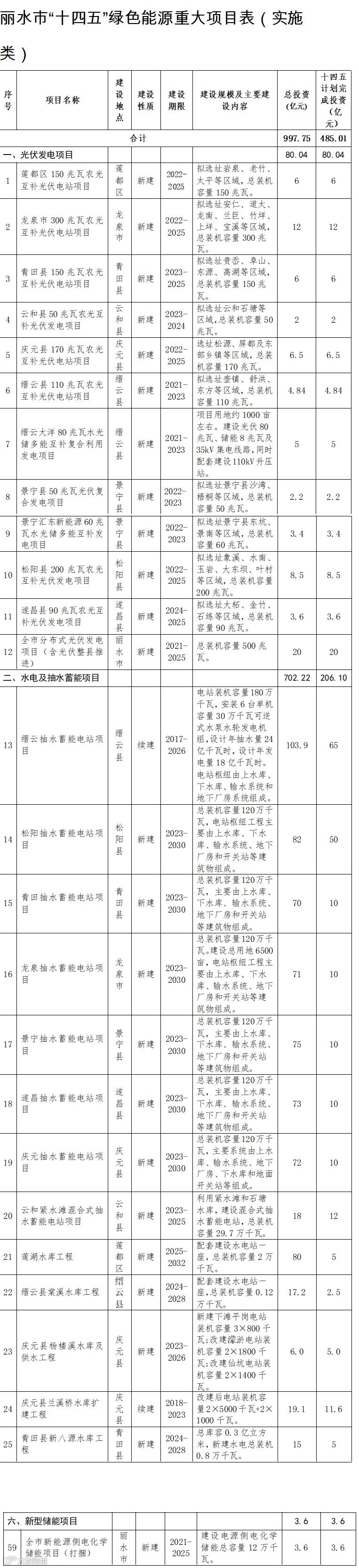 文件还列出了丽水绿色能源重大项目表,其中与实施和储备的抽水蓄能项目达26项,新储能项目为5项。