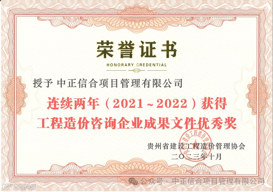 2023年10月,经贵州省建设工程造价管理协会根据《关于开展2022 年度贵州省工程造价咨询成果文件质量评定工作的通知》(黔造价协〔2023〕18 号)文件要求,组织对全省各工程造价咨询企业报送的 2022年度工程造价咨询成果文件进行了质量评定,我公司荣获“2022年度工程造价咨询企业成果文件优秀奖”。这是公司连续两年获此殊荣。