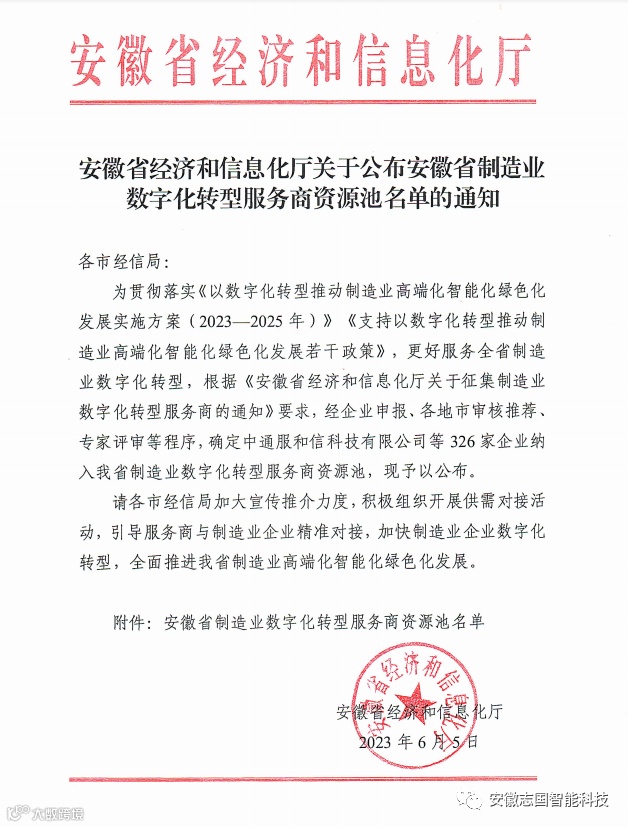 导读:2023年6月5日,安徽志国智能科技有限公司成功入选安徽省制造业数字化转型服务商资源池。