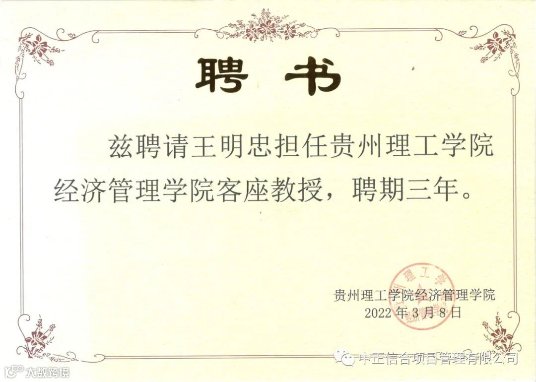 热烈祝贺中正信合项目管理有限公司董事、总经理王明忠同志,被贵州理工学院经济管理学院聘任为客座教授。
