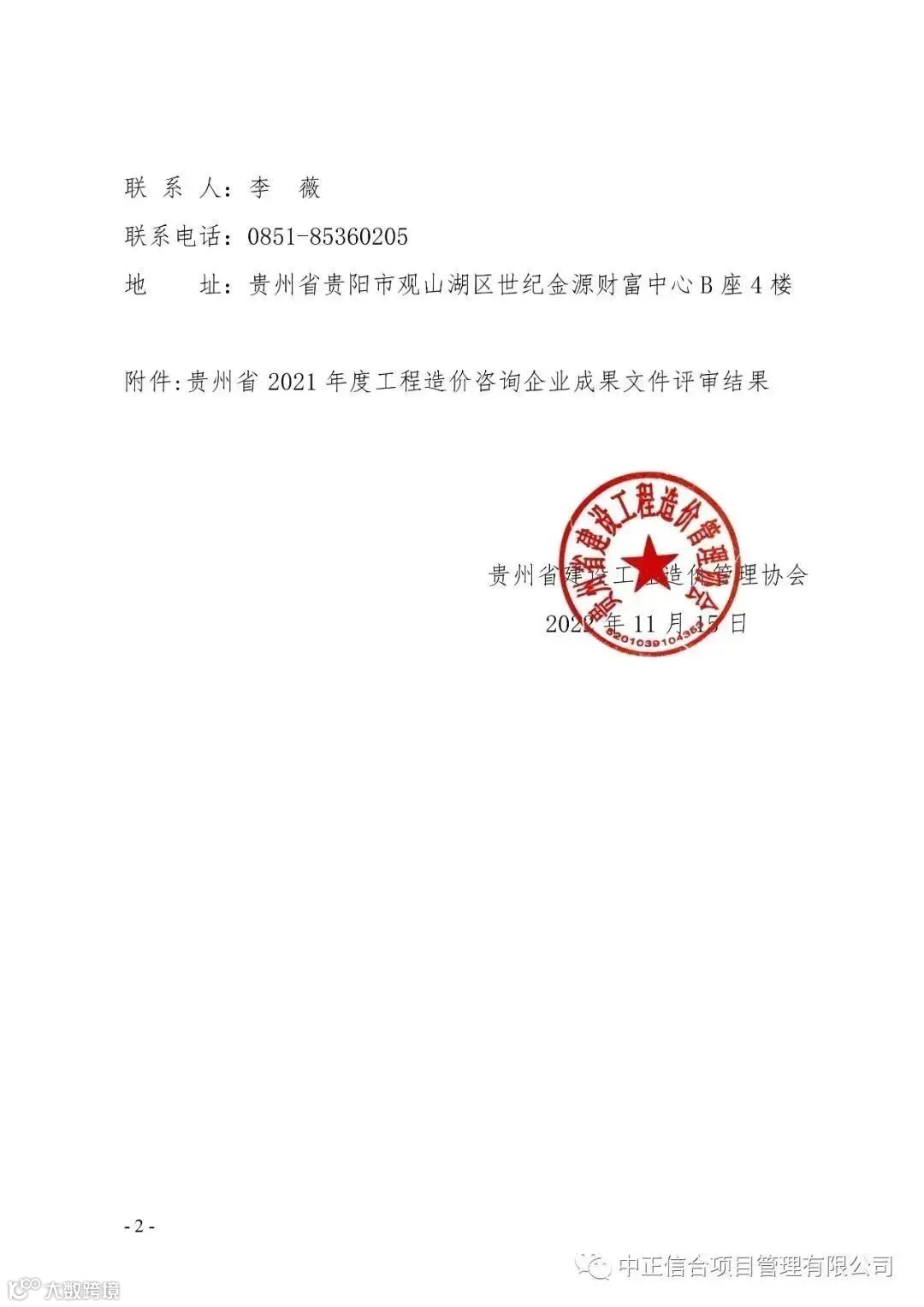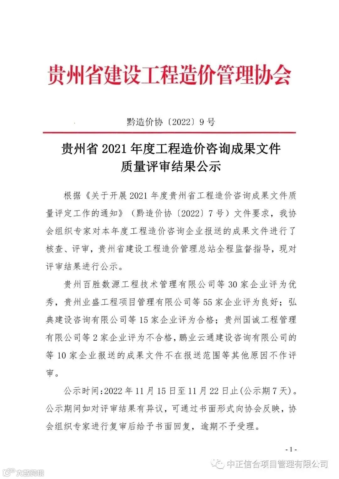 导读:据贵州省建设工程造价管理协会消息,2021年度工程造价成果文件质量评审工作已经结束。中正信合项目管理有限公司