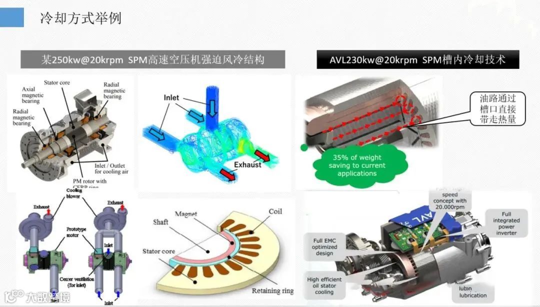 “内油冷”在电机必须封闭防护,或者无强风的应用环境中,采用最多的是内油冷方式,比如AVL设计的高速电机采用的定子槽内油冷的方式的组合。有些电机也采用绕组喷油冷却+定子油冷+转子油冷等多种方式的组合。