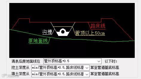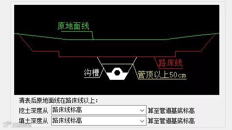 此时不论管顶以上50cm位于路床线以上还是路床线以下,排水管道回填量都是路床线和管道基底标高以及两边放坡形成的断面扣除管道基础及管道部分。