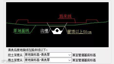 情景二:填方路段清表后原地面线在路床线以下,原地面线在管道基底标高以上