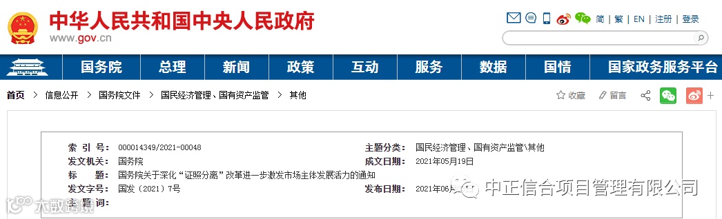 近日,中国政府网发布《国务院关于深化“证照分离”改革进一步激发市场主体发展活力的通知》(国发〔2021〕7号)。
