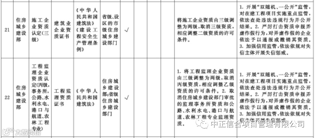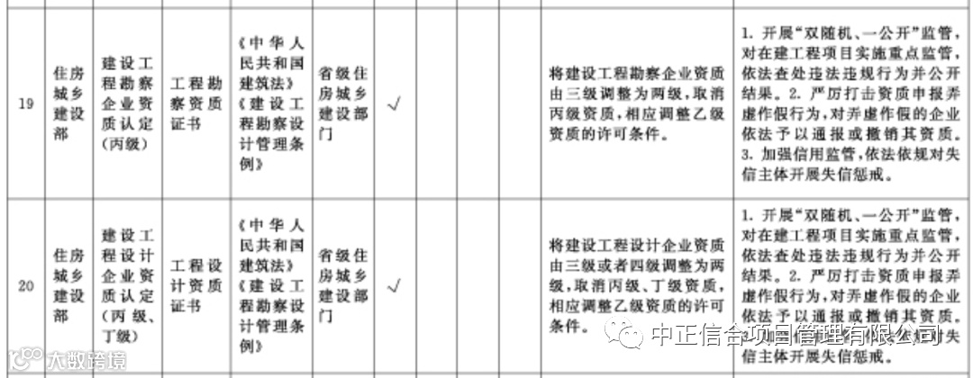在全国范围内直接取消部分工程资质审批,其中包括工程造价、房地产开发资质、建设工程勘察、建设工程设计、施工企业资质三级、工程监理资质: