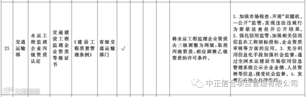 将工程监理资质企业资质由三级调整为两级,取消丙级资质,相应调整乙级资质的许可条件;取消住房城乡建设部门审批的监理事务所资质和公路、水利水电、港口与航道、农林工程专业监理资质。