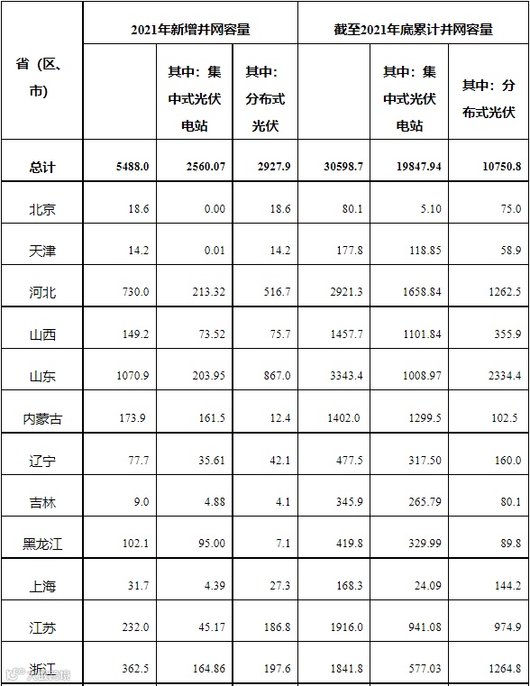早在2022年1月28日,国家能源局在一季度网上新闻发布会曾公布了2021年光伏发电建设和运行整体情况,2021年,全国光伏新增装机5488万千瓦,为历年以来年投产最多,其中,光伏电站2560万千瓦、分布式光伏2928万千瓦。到2021年底,光伏发电累计装机3.06亿千瓦。从新增装机布局看,装机占比较高的区域为华北、华东和华中地区,分别占全国新增装机的39%、19%和15%。