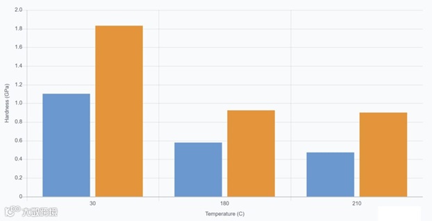 图4:纳米晶银(橙色)在不同温度下的硬度大约是传统Ag涂层(蓝色)的两倍(图片Xtalic)