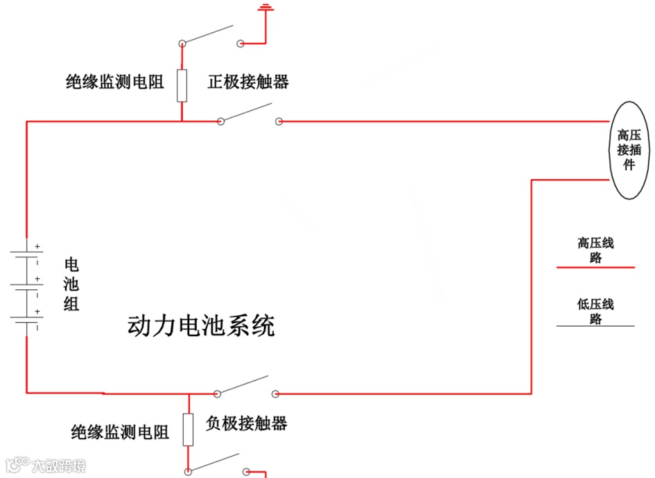 动力电池正负极通过绝缘层与底盘构成电流回路,当整车绝缘下降时漏电电流就会增大,漏电电流达到一定值时,将危及乘客安全以及整车电气系统的正常运行。新能源汽车的绝缘电阻监测系统主要是通过在正极动力电缆与底盘,负极动力电缆与底盘之间分压的方式,来测量动力电缆相对于车辆底盘的绝缘程度。为了简化结构,通常将绝缘电阻监测模块设在动力电池系统内,并把绝缘电阻监测功能集成到BMS上