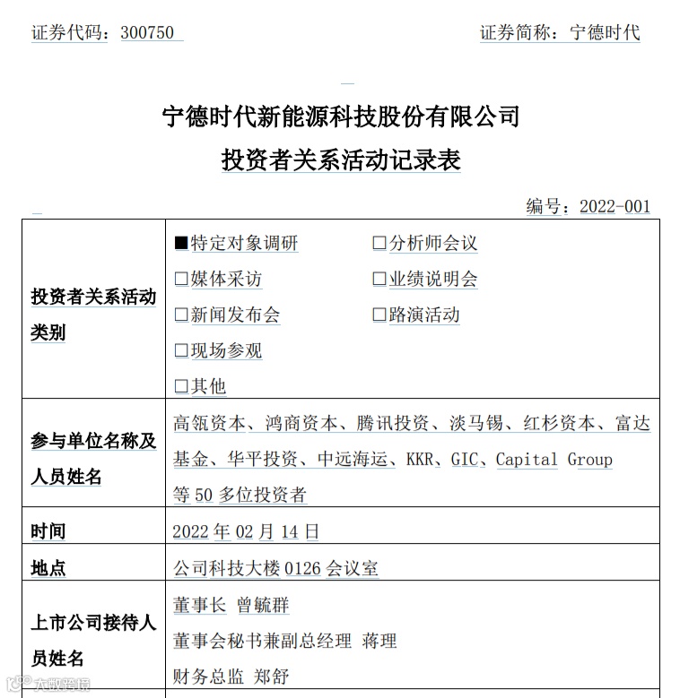 2月15日晚间,全球动力电池龙头企业宁德时代(300750)发布公告,披露了2月14日董事长曾毓群、董事会秘书兼副总经理蒋理、财务总监郑舒接受包括高瓴资本、鸿商资本、腾讯投资、淡马锡、红杉资本等在内的50名投资者调研的情况。