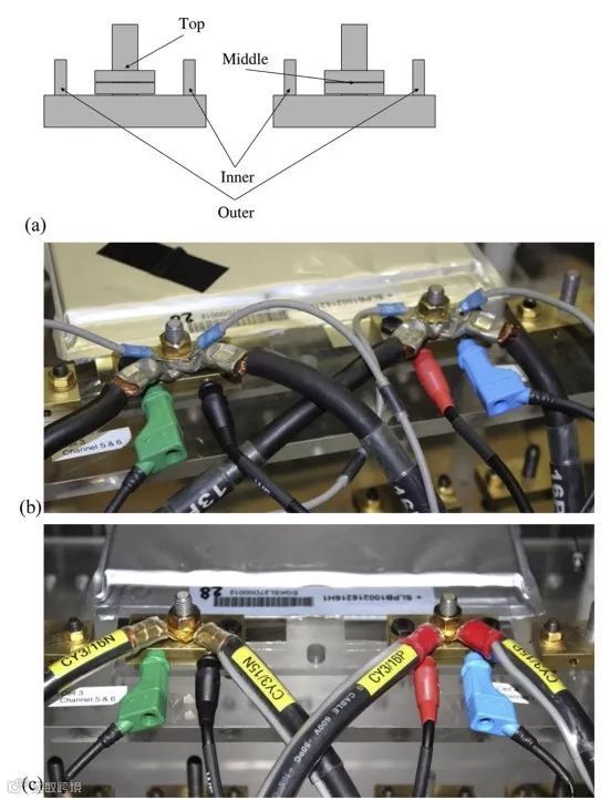 图4. (a)连接块结构;(b)将电压线布置在顶部;(c)电压线和电流线绞合后再连接。