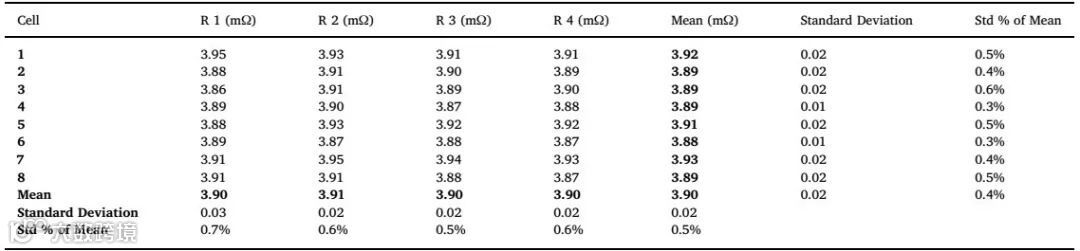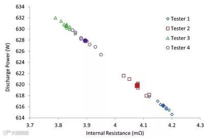 表1. 四名研究人员对相同8个电池进行脉冲功率测试结果对比。