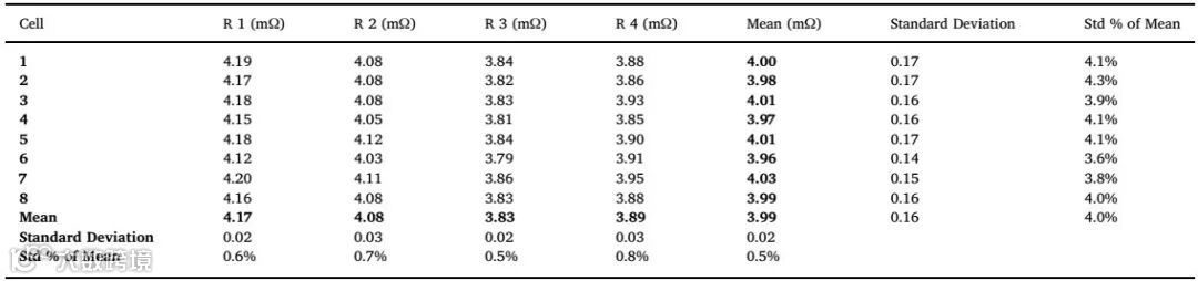 首先,作者准备了8个容量20 Ah的锂离子电池,依次让四名不同的研究人员利用相同的测试设备对该8个电池按照IEC 62660-1规定的脉冲功率测试要求(如图1)进行测试。如表1所示,脉冲功率测试得到的内阻标准偏差在0.5-0.8%区间,表明电池本身的一致性和四名不同研究人员实验的重复性是很好的。但如表1最后一列所示,对同一块电池,四名研究人员测试内阻的偏差高达4%,四名研究人员测试结果的不同在图2中可以明显观察到。