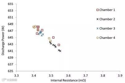 图6. 四个不同温箱得到放电功率vs内阻结果对比。电池为80%SOC,设定温度为25 ℃。