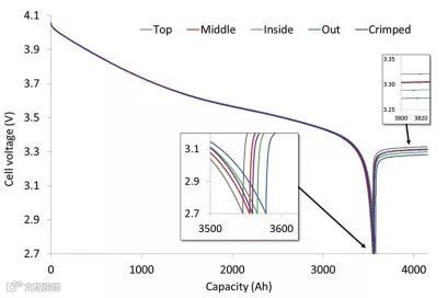 如图5所示,当电压线布置在不同的位置时,电池的放电曲线也存在差异。电压线监测的是开路电压,外电阻越大放电时越快达到放电截止电压,反之亦然。当电压线如图4b布置在连接块顶部(top)时,电流回路最长,因此放电持续时间最短;而当电压线布置在靠近电池Tab附近(inside和out)时,电流回路最短,放电持续时间最长。图4c中将电压线和电流线进行绞合连接的主要目的在于提高测试的可靠性和可重复性。