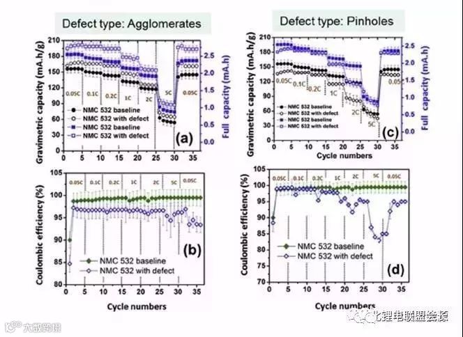 图7是团聚体和针孔对电池倍率容量和库伦效率的影响曲线,团聚体居然能够提高电池容量,但是会降低库伦效率。针孔降低电池容量和库伦效率,而且高倍率下库伦效率下降幅度大。