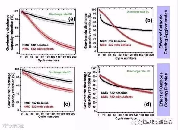 后面部分对锂离子电池极片表面缺陷的检测技术新方法-红外热成像技术以及这些不同缺陷与电化学性能之间的关系简单介绍。参考D. Mohanty等对此进行的深入研究。