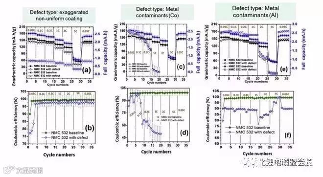 图 8 正极不均匀涂层、以及金属异物Co和Al对电池倍率容量和库伦效率的影响