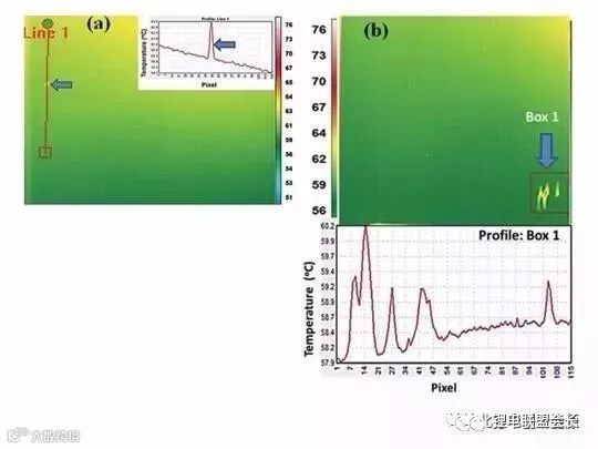图5(a)是热成像仪探测到的NMC正极极片涂层表面的温度分布图,其中包含了一个非常细小的缺陷,肉眼无法分辨。途中线段对应的温度分布曲线如内插图所示,在缺陷点出现温度尖峰。图5(b)图像对应的方框内出现温度局部升高的情况,对应极片表面的缺陷。图6是负极极片表面温度分布图显示了缺陷的存在,其中温度升高的峰对应气泡或者团聚体,温度降低区域对应针孔或者掉料。