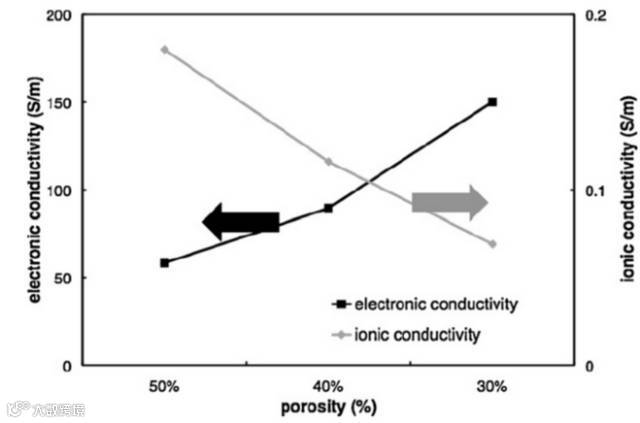 电解液填充在多孔电极的孔隙中,锂离子在孔隙内通过电解液传导,锂离子的传导特性与孔隙率密切相关。孔隙率越大,相当于电解液相体积分数越高,锂离子有效电导率越大。而正极极片中,电子通过碳胶相传输,碳胶相的体积分数,碳胶相的迂曲度又直接决定电子有效电导率。