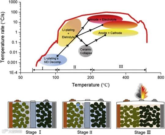 热失控由一系列的链反应引起。新鲜电池的热失控通常是由短路引起的,随后电解液发生反应,电池温度达到最高。而快充后的电池热失控过程可以分为三个阶段,如图10所示。第一阶段(60℃ < T< 110℃),析出的锂与电解液反应加热电池,SEI膜不断破裂与再生,此时温度相对较低。第二阶段(热失控诱发阶段),锂金属在与电解液的反应中被大量消耗,造成温度急剧升高。隔膜收缩,正负极接触。第三阶段(热失控至最高温度),由于温度突然升高,正负极与电解液及正负极之间开始发生反应。最终电池温度达到最高并发生热失控。