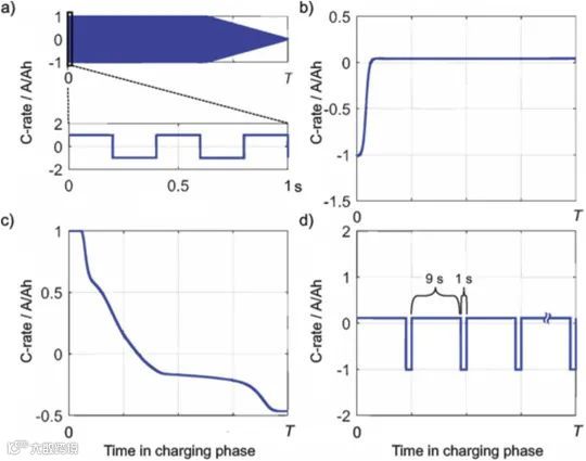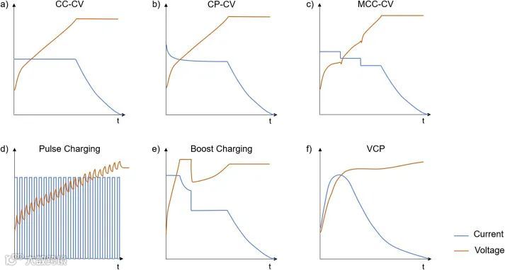 CCCV是目前最常见的充电协议,即先恒流充电至截止电压(CC阶段),再恒压充至接近0的小电流(CV阶段)。恒压过程可以使电极材料内的离子浓度分布更均匀,对于材料发挥出高比容量至关重要;但恒压时的电流逐渐减小,使CV的充电时间明显比CC长。CC-CV充电模式的简单可操作性使其成为最广泛应用的标准充电协议。但是很多其他重点策略可以减少充电时间、提高充电效率、提高容量/功率保持率。图8展示了几种常见的快充策略曲线。