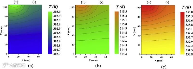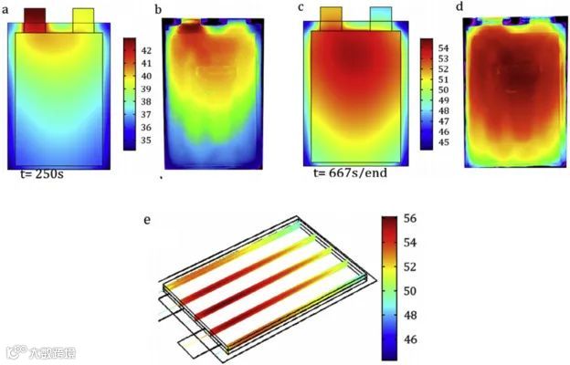锂离子电池中,软包、圆柱、方壳电池的热量分布与散失是不均匀分布的:例如一些电池材料的面导热能力较差,因此其热量相对于表面会更多积累在核心位置。此外,电流密度和产热速率在电池不同位置也不相同。这些不一致性在大尺寸电池上被进一步放大。如图3所示,圆柱电池内部中心的温度要明显高于表面。对于软包或方型电池而言,如图4和图5所示,极耳处的温度要明显高于其他位置。此外,由于正极铝集流体比负极铜集流体的电阻更大,正极极耳温度常高于负极极耳。