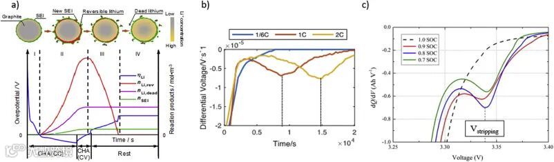 a)CC-CV充电和静置过程中的过电势变化模拟。阶段I,负极颗粒上没有锂沉积;阶段II,锂沉积开始发生;阶段III,部分可逆的锂重新嵌入负极或溶出,剩余的变成死锂;阶段IV,平衡态,死锂不再参与后续循环;b) 电压微分分析(DVA);c)微分容量分析(ICA)