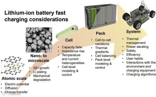 近年来,为限制气候变化和空气污染的影响,锂离子电池在纯电动汽车中的广泛应用正在加速。 但是相比于传统的燃油车,里程焦虑、充电时间长等问题成为阻碍电动汽车发展的主要问题。 因此,快速充电(Fast Charging)能力的提升成为电池厂商和整车厂普遍的发展目标。 但是,研究表明低温、大倍率充电会引起电池的容量与输出功率等性能加速衰减;另一方面,电池在充电期间产生的大量热难以均匀、有效地散去,也会引起衰减加速以及其他安全问题。 图1展示了从原子层级到车用系统层级下影响锂离子电池快速充电的因素。 本文着眼于现有文献的回顾与总结,分析每一种层级下的关键技术限制因素。