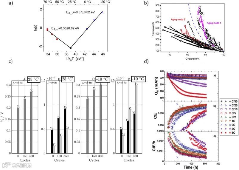 无损的析锂观测技术对于实际的电池应用很重要。一般可用于析锂表征的检测包括SEM,TEM,NMR和XRD等,但这些手段都需要对电池进行破坏或使用特殊电池构型。常用的无损析锂观测利用电池的外部特性,包括老化速率,锂回嵌的电压平台,模型预测等方法。如图6所示,基于老化特征的析锂检测手段包括(a)阿伦尼乌斯方程,(b)衰减过程的容量和阻抗变化分析,(c)非线性频域响应分析和(d)库伦效率分析。