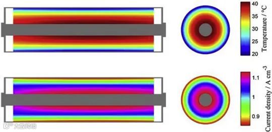 图3 圆柱电池内部温度和电流密度的分布仿真结果
