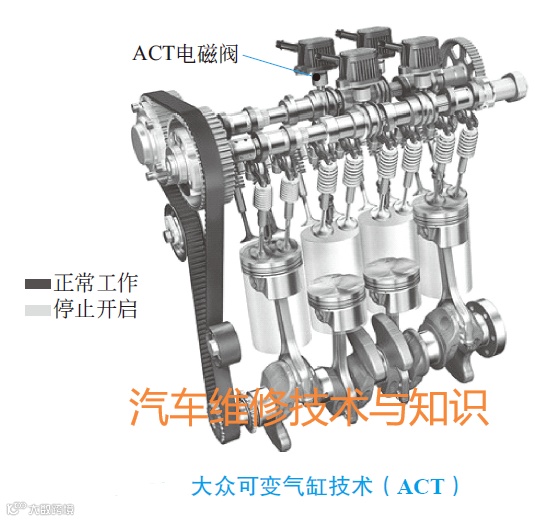公司所研制的,可变气缸技术首次被使用在小排量车型上,如下图所示。第2、第3缸的4个凸轮各自对应一个ACT电磁阀,在工况允许的情况下,电磁阀将正常工作的凸轮切换至零