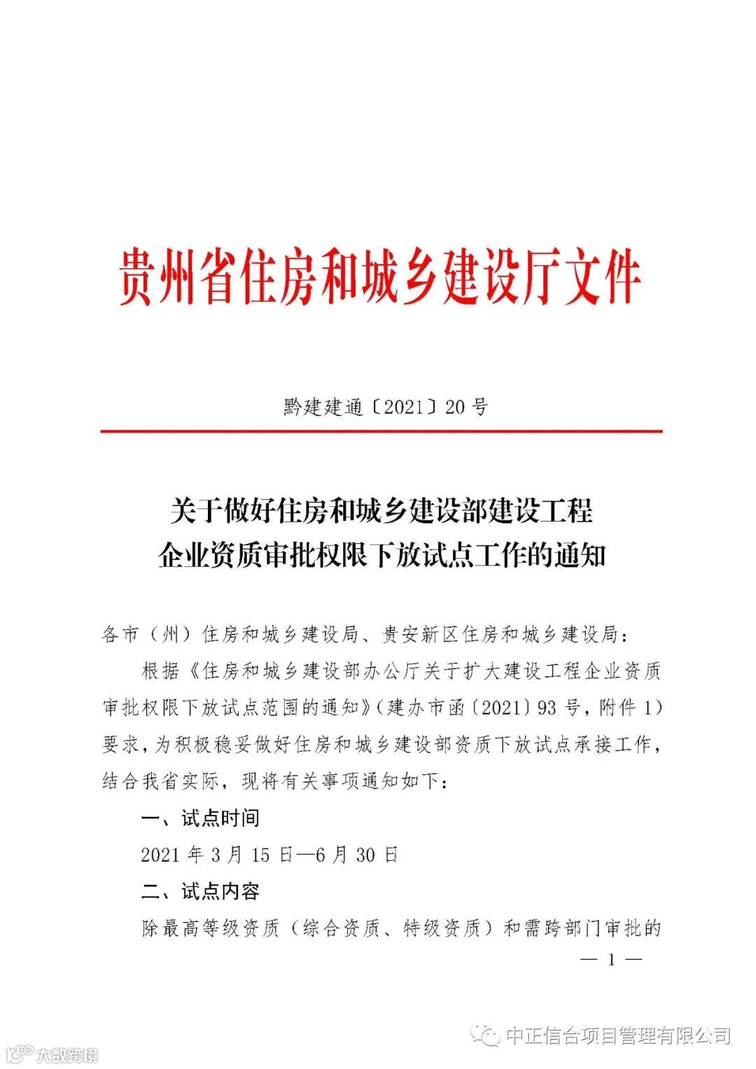 导读:关于做好住房和城乡建设部建设工程企业资质审批权限下放试点工作的通知(黔建建通〔2021〕20 号)