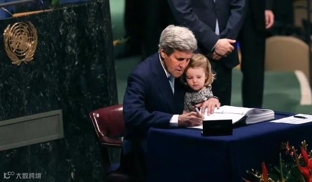 当地时间2016年4月22日,克里抱着孙女签署《巴黎协定》。图源视觉中国