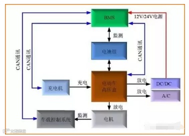 在电动汽车上,与高压配电盒相连接的高压部件包括:动力电池、电机控制器、变频器、逆变电源、电动空调、电动除霜、充电座等。