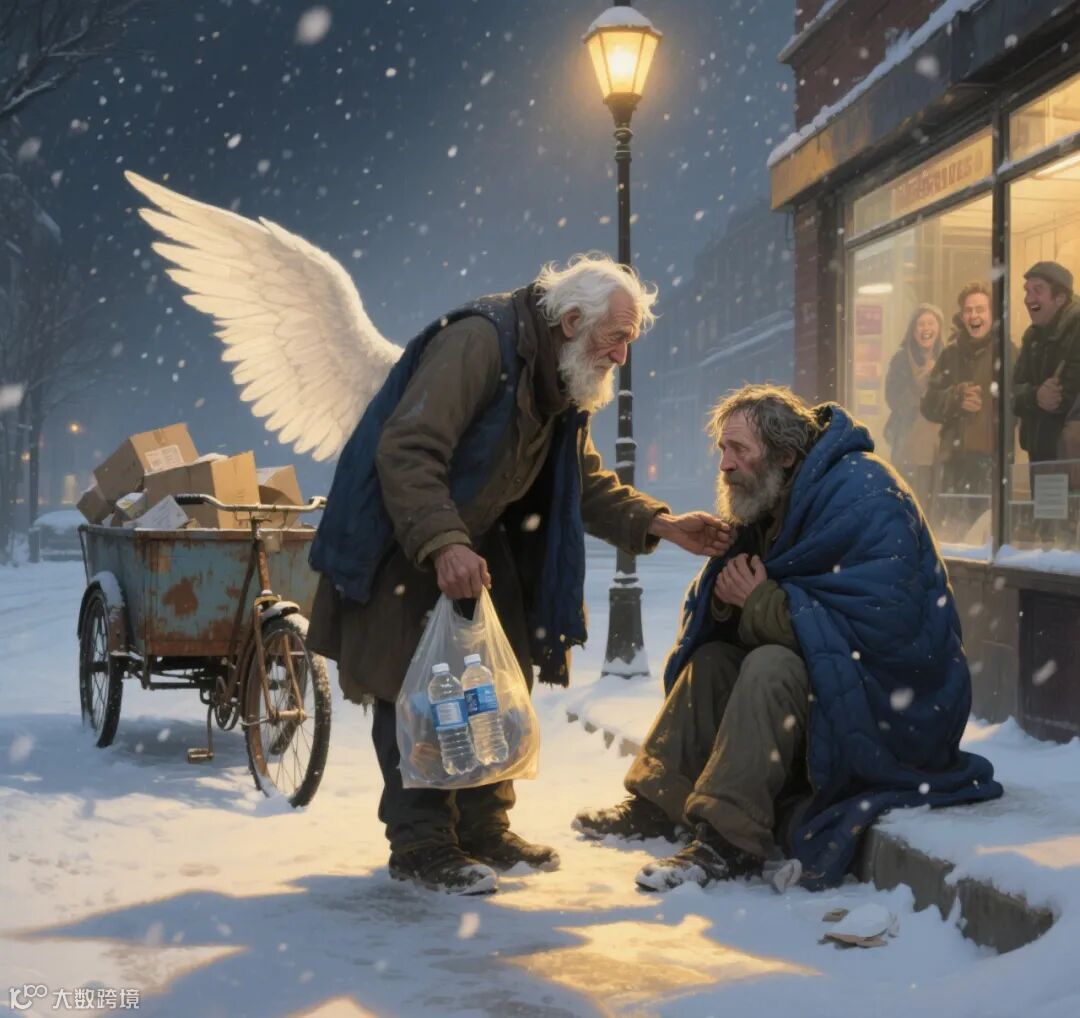 在一个寒冷的冬日,一位拾荒老人看到路边蜷缩着一位冻得瑟瑟发抖的流浪汉。老人毫不犹豫地将自己仅有的一件厚外套披在流浪汉身上,还把当天拾荒换来的钱买了热乎的食物给他。周围的人笑老人太傻,可老人却说:“看到他受苦,我心里难受,能帮一点是一点。” 这位拾荒老人或许生活并不富裕,但他的善良却如同一束光,照亮了那个寒冷的角落。